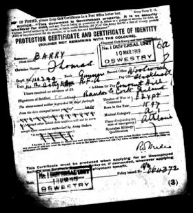 Thomas Bernard Barry, with an address at The Arcade, Roscarberry, Co. Cork, enlisted in the British Army on 30 June 1915 and was posted to the Royal Field Artillery depot at Athlone on 1 July 1915. He was 5ft 71⁄4ins tall, and according to the record he declared himself to be over nineteen years old, although on discharge from the army in 1919 he recorded his correct year of birth as 1897.